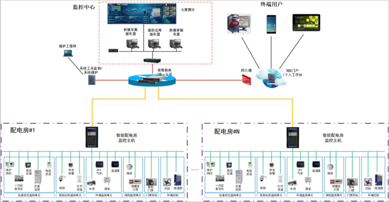 基于电力物联网架构的智能配电房,实现了对生产区域中各子系统的数据采集、自动控制和信号联锁等功能,电气监控深度整合,建设具有可视化、一体化、智能化的辅助平台。