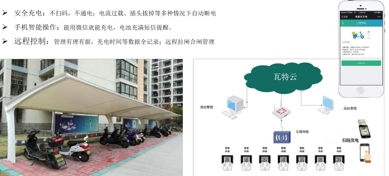 安全充电、电流过载、插头拔掉等多种情况下自动断电;能用微信就能充电,远程控制充电时间等数据全记录。