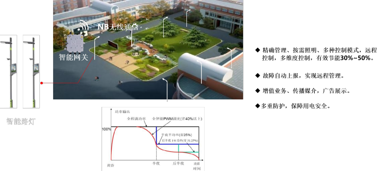 精确管理、按需照明、多种控制模式、远程控制、多维度控制、有效节能30%~50%;增值业务、传播媒介、广告展示,多重防护,保障用电安全。